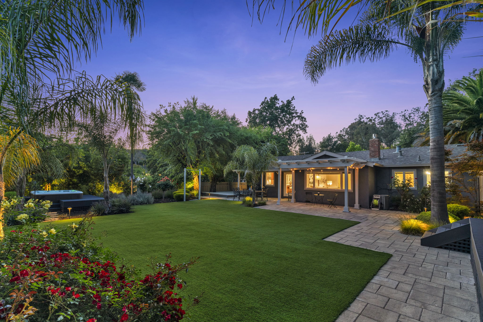 Palm trees and colorful gardens enhance this transportive outdoor vacation sanctuary with a swim spa, lush level lawns, wooden pergola, rose bushes - the ultimate California entertainer's paradise!